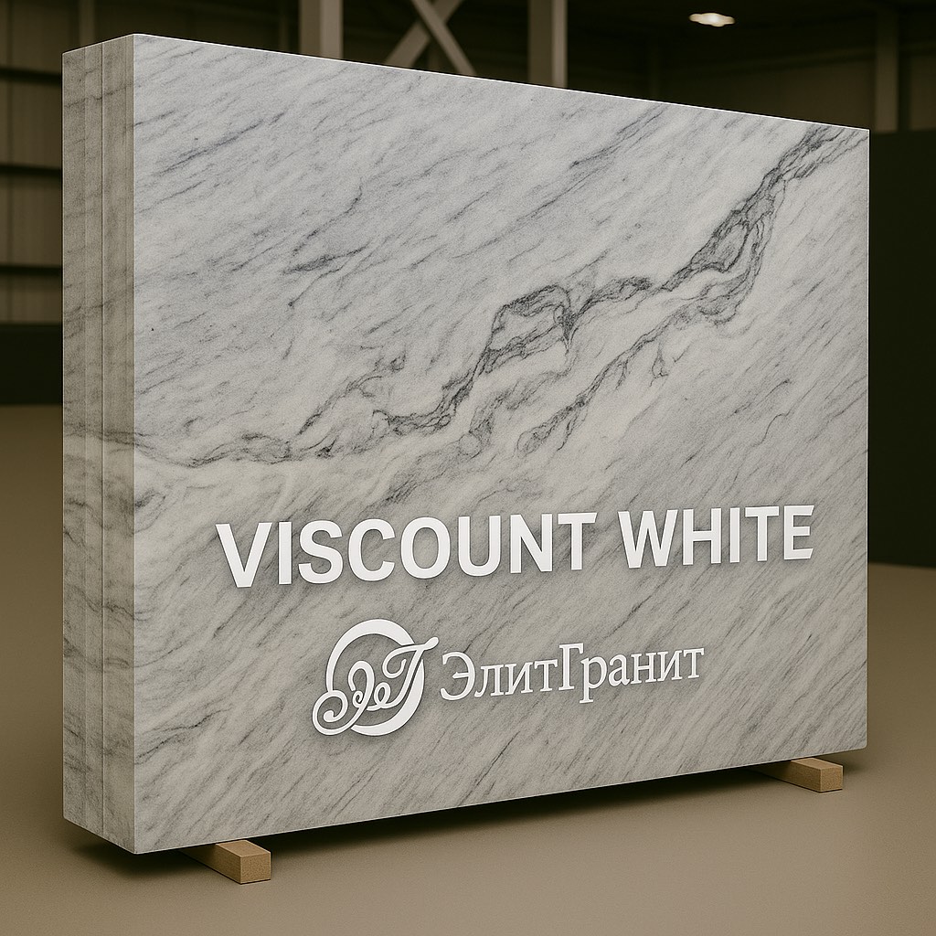 Viscont White — изысканный индийский гранит с эффектным контрастным рисунком. Основу составляет светло-серый фон, по которому проходят живописные волнообразные прожилки тёмно-серого и графитового оттенков. Камень хорошо шлифуется и полируется, придавая поверхности элегантный глянец. Благодаря своей прочности и выразительности используется в интерьерах, облицовке, на кухонных столешницах, памятниках и архитектурных элементах.