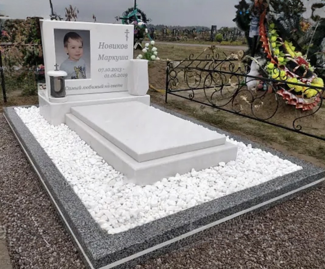 Такая композиция подчёркивает светлую память о ребёнке, сохраняя эстетику и чистоту формы. Каждый элемент подобран с особой заботой: простота линий, белый мрамор, натуральные материалы и фотостекло создают утончённый образ скорби и любви.