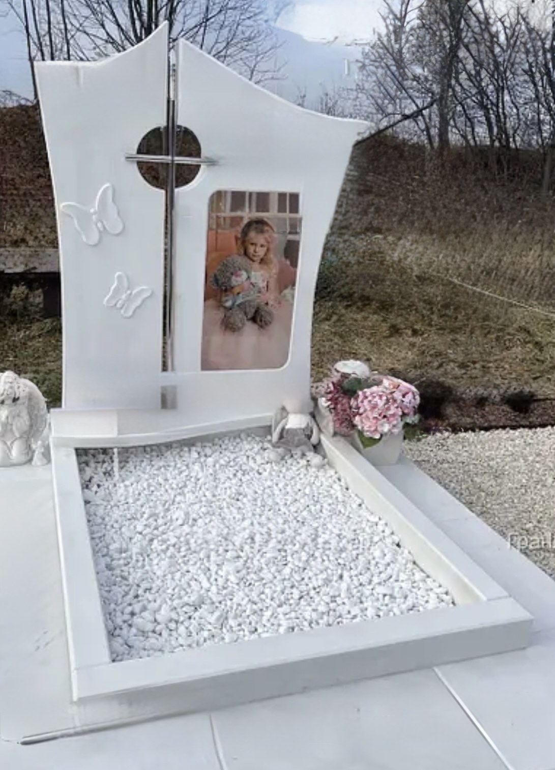 Плавные линии, округлая форма и использование только светлых оттенков создают утончённый, светлый образ, подходящий для детского захоронения. Всё оформлено со вкусом, бережно и с уважением к памяти.