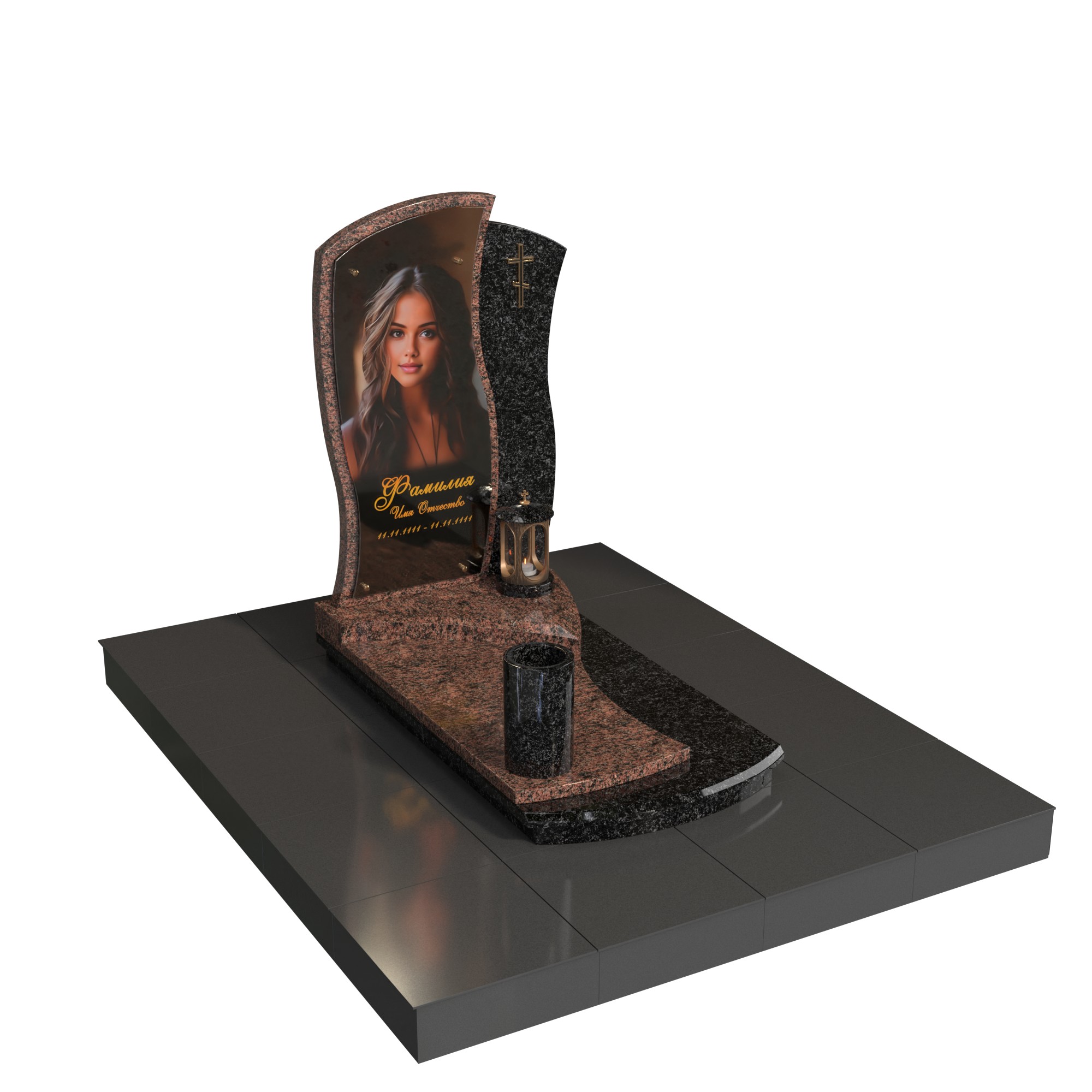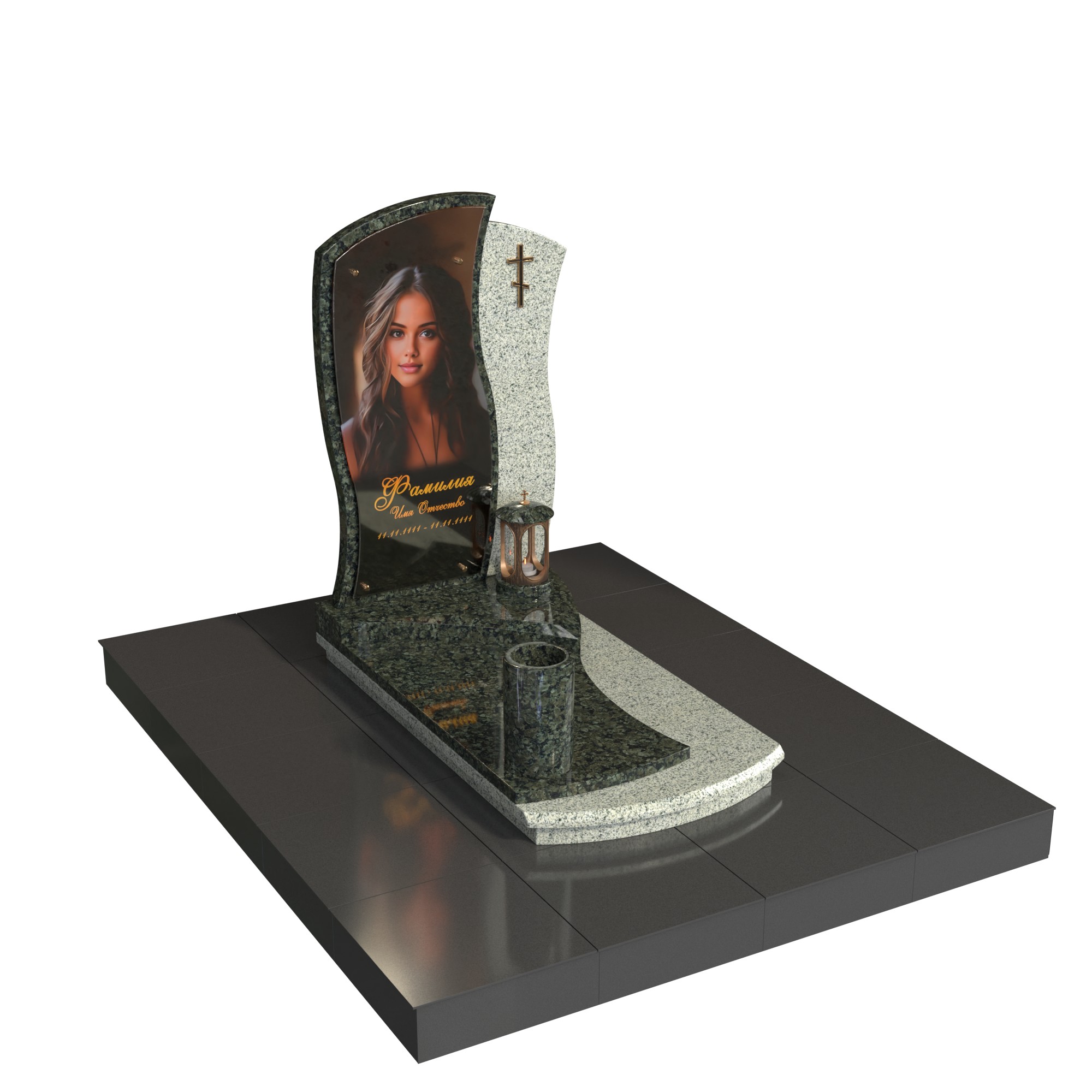 Памятник «Волна памяти» — современный мемориал из натурального камня с выразительной изогнутой стелой. Плавная линия формы напоминает волну и мягко обрамляет фотопортрет на стекле (крепление на метизах). Контраст фактур в плите и бортах придаёт композиции глубину, а аккуратные аксессуары — лампада и цилиндрическая ваза — завершают ухоженный, торжественный вид участка.