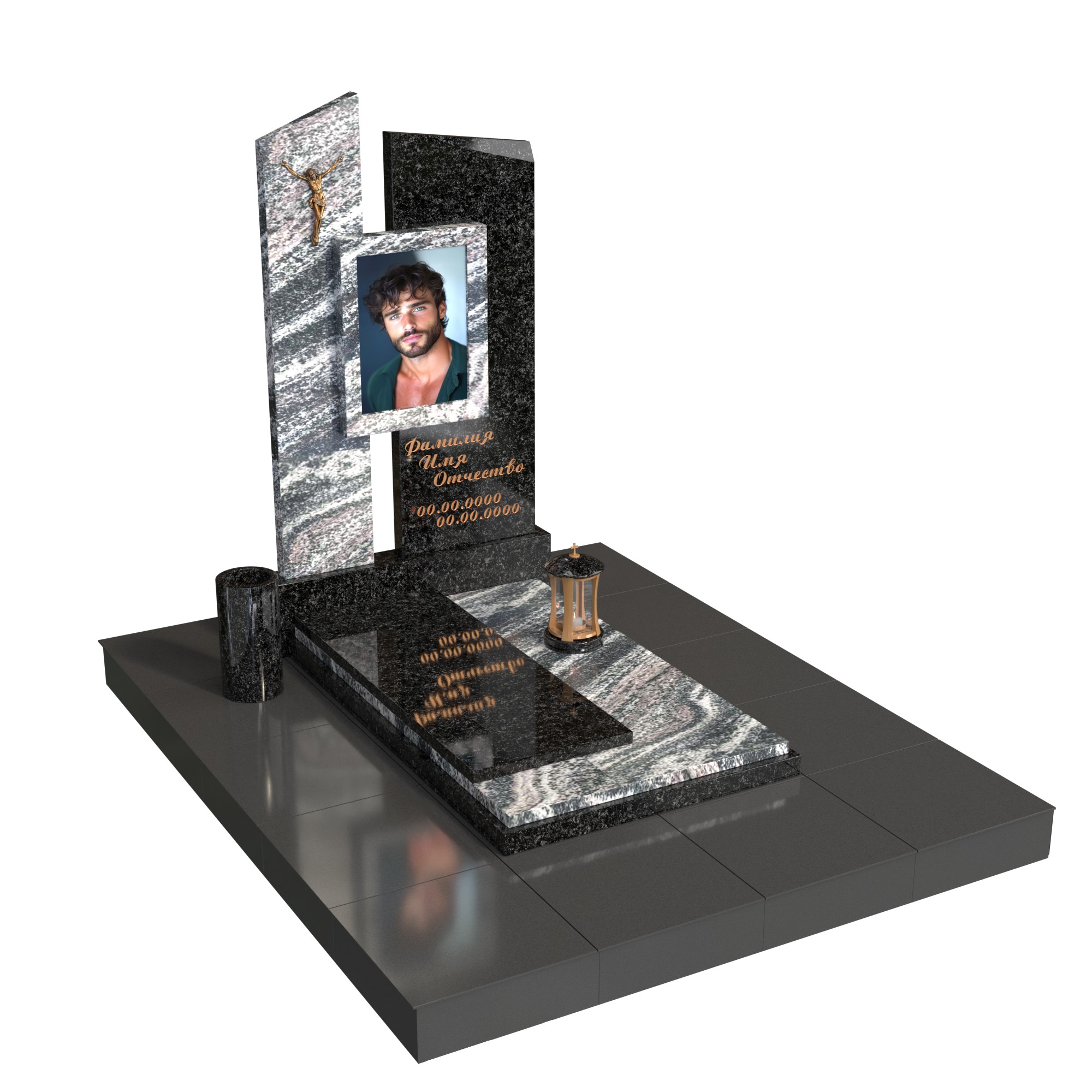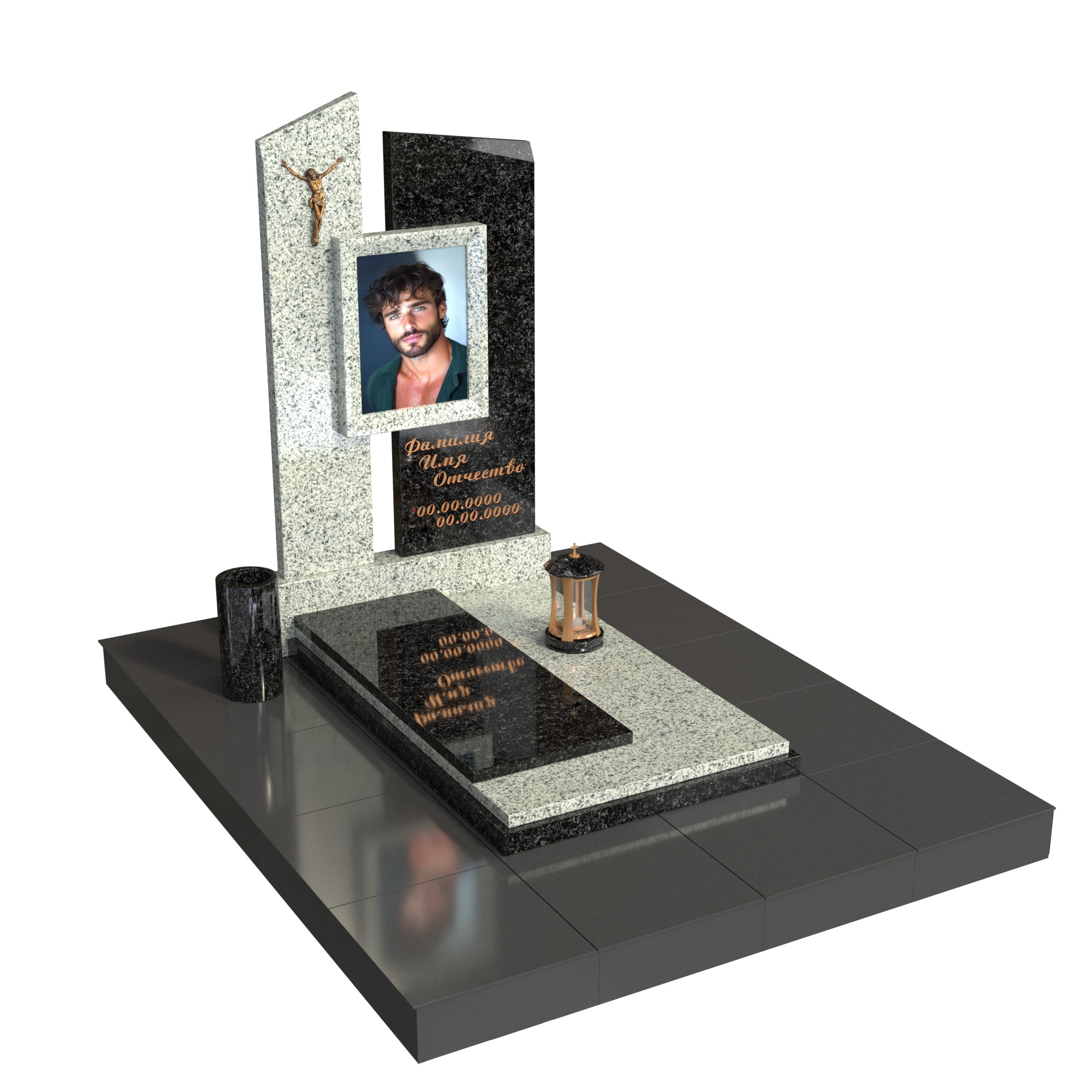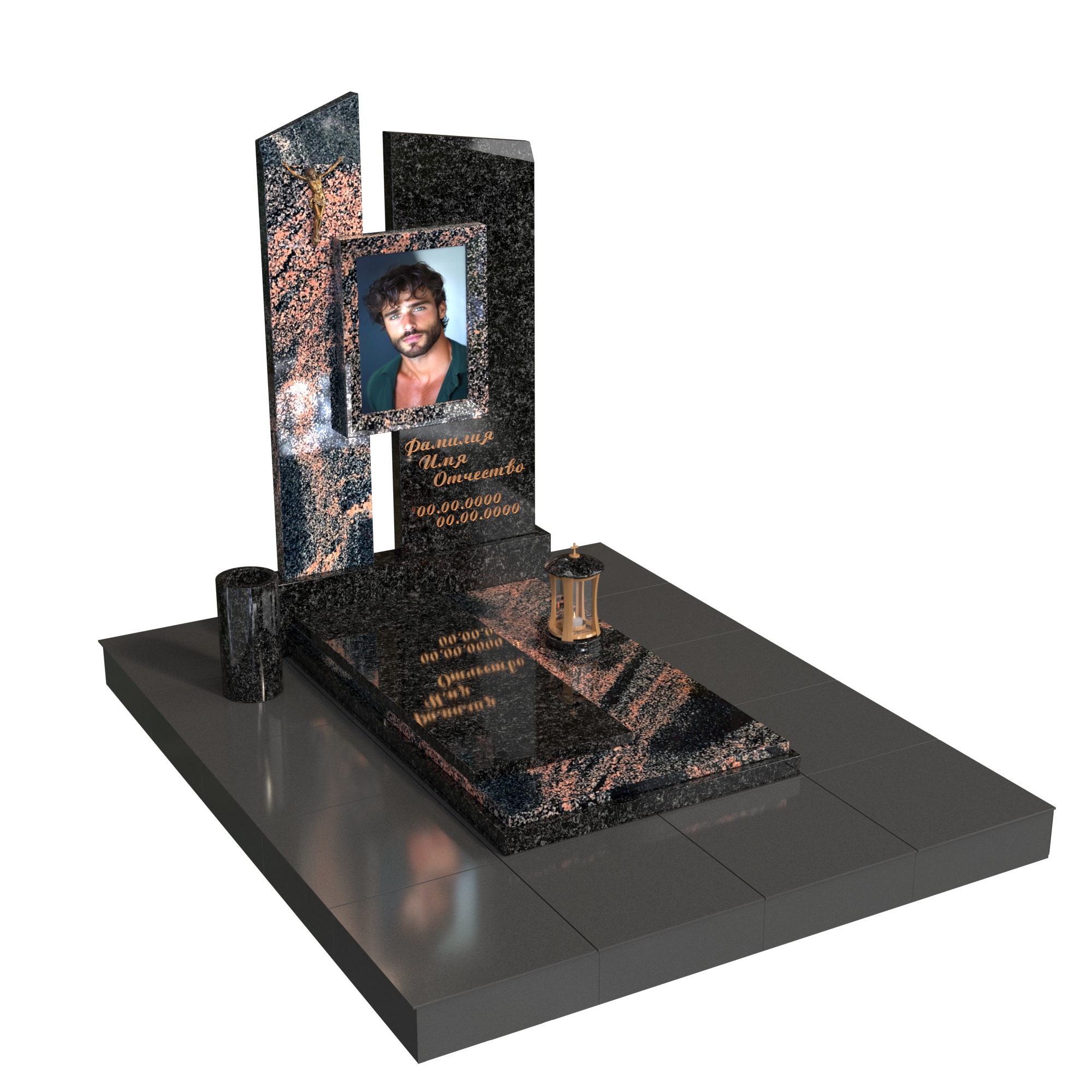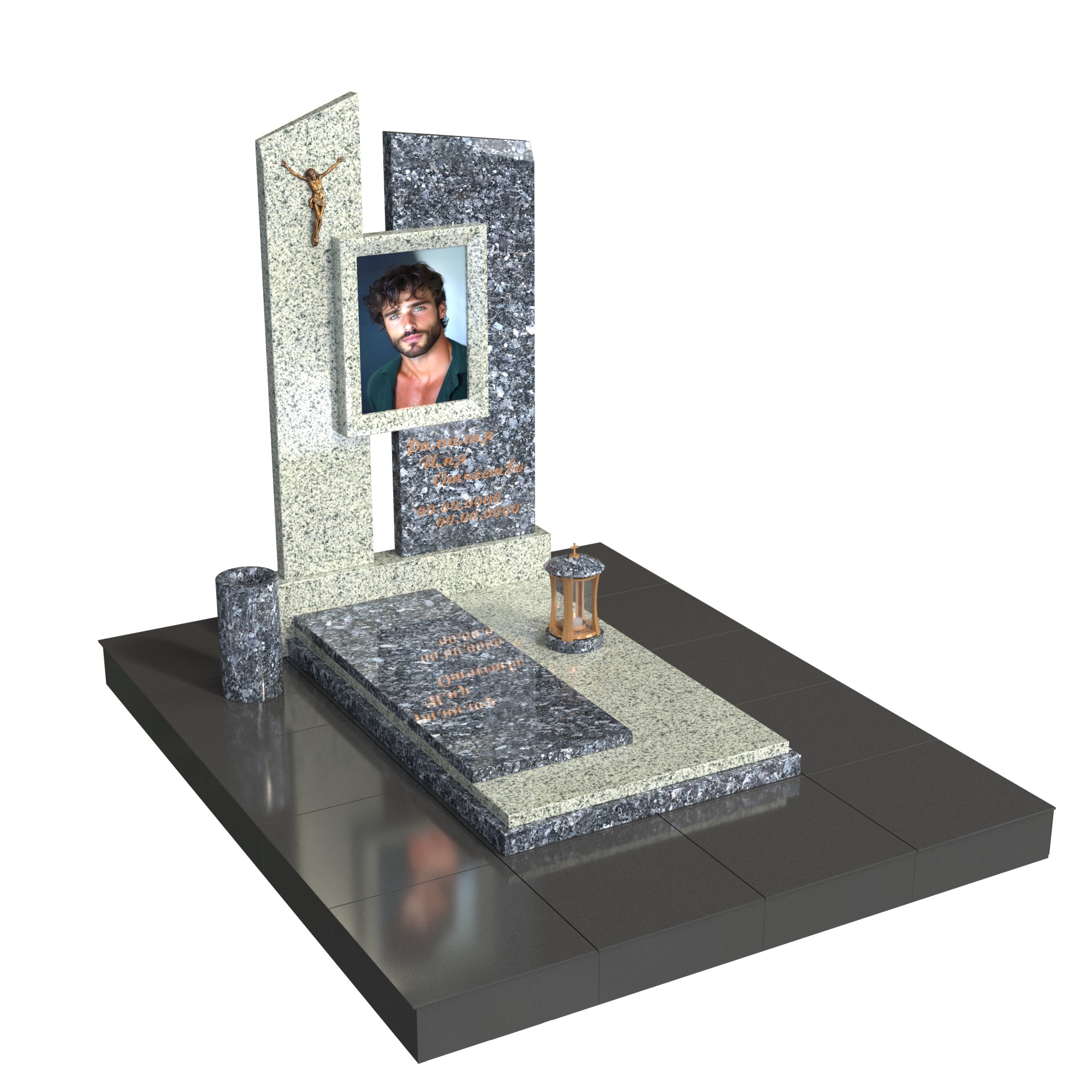 Две асимметричные вертикальные плиты словно символизируют силу и защиту, а размещённый между ними фотопортрет в стеклянной вставке делает композицию живой и личной. Бронзовая фигура Христа добавляет сакральный смысл, а лампада и ваза завершают образ продуманной, целостной мемориальной архитектуры.