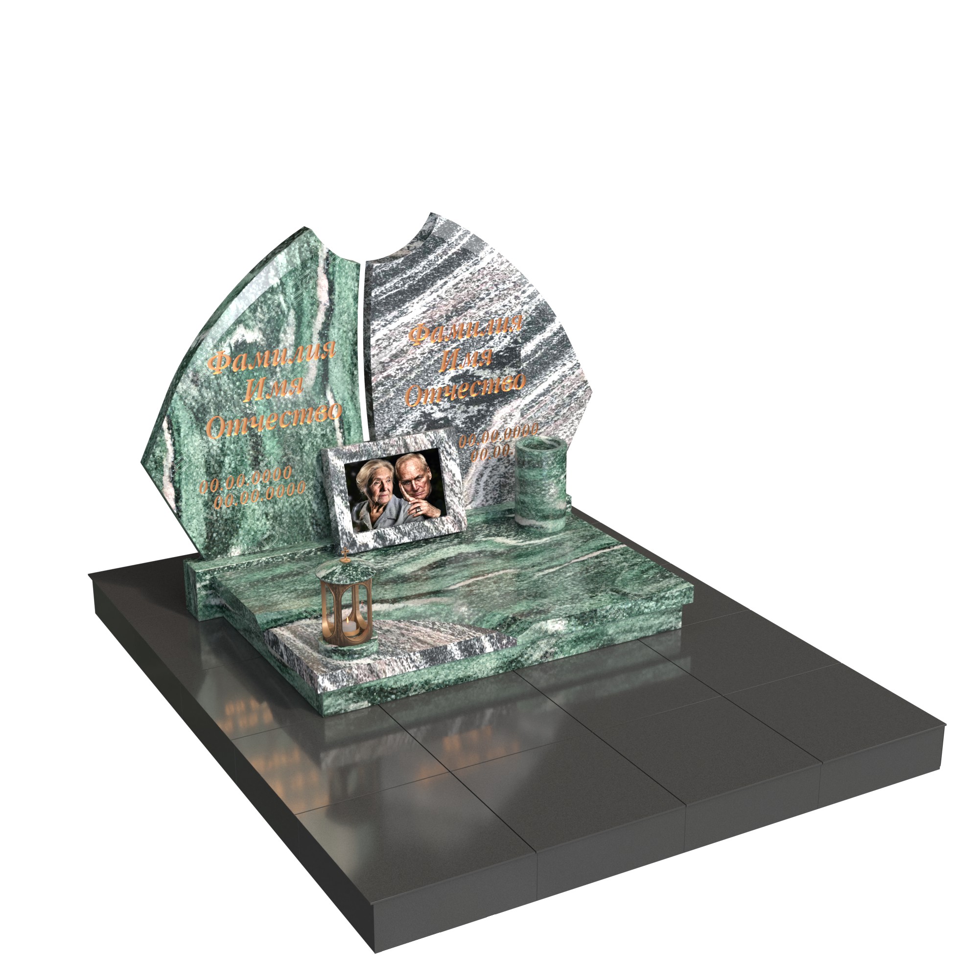 Контрастное сочетание благородных пород гранита подчеркивает индивидуальность каждого, а общее основание объединяет их в вечном союзе. На горизонтальной плите предусмотрено место для фоторамки с изображением пары — как напоминание о нежности и жизненном пути, пройденном вместе.