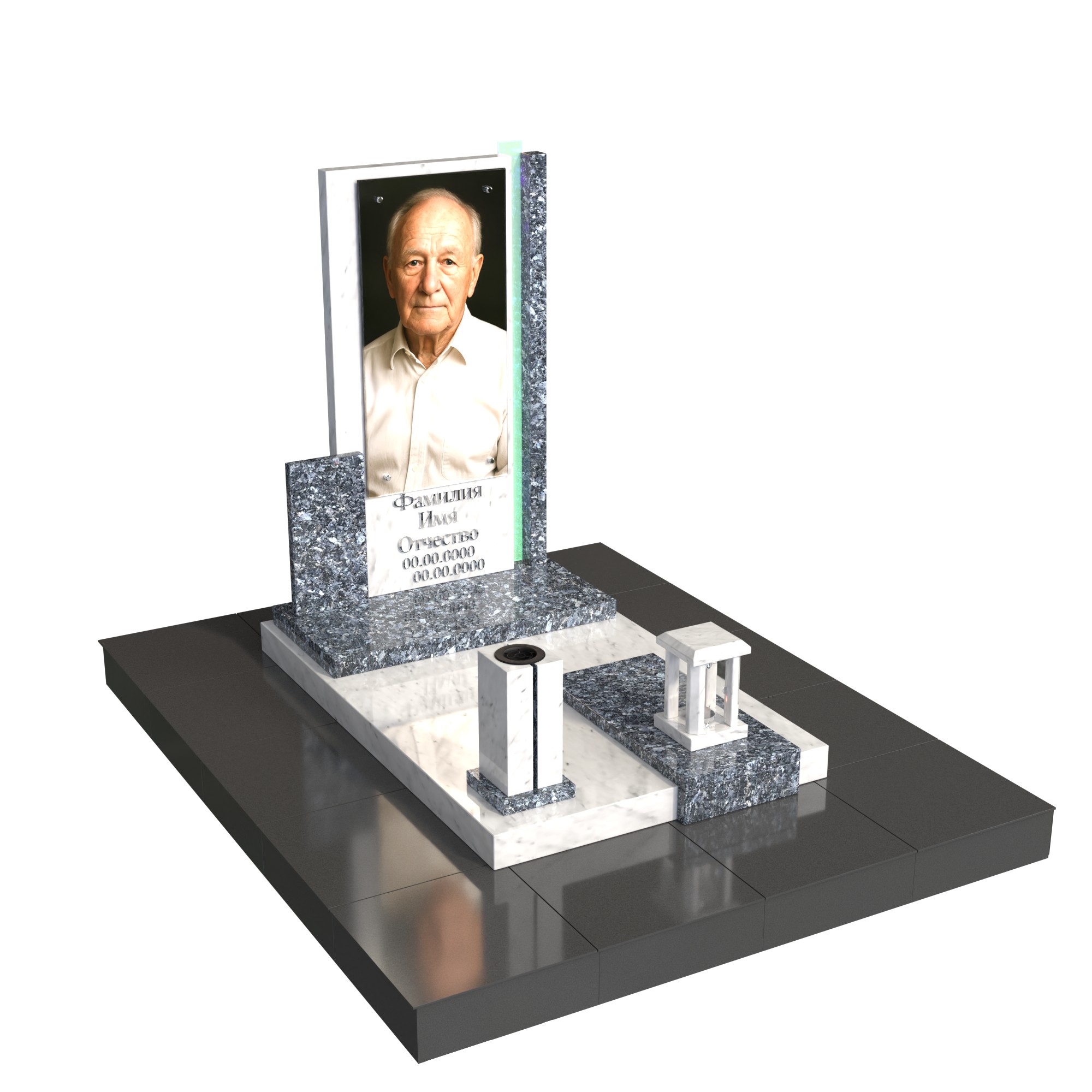 Фотопортрет размещён на стекле, зафиксированном на декоративных метизах — это создаёт эффект глубины и делает образ особенно живым. Центральная стела и элементы благоустройства (лампада, цветочная ваза) оформлены в едином стиле, подчёркивая целостность и продуманность дизайна.