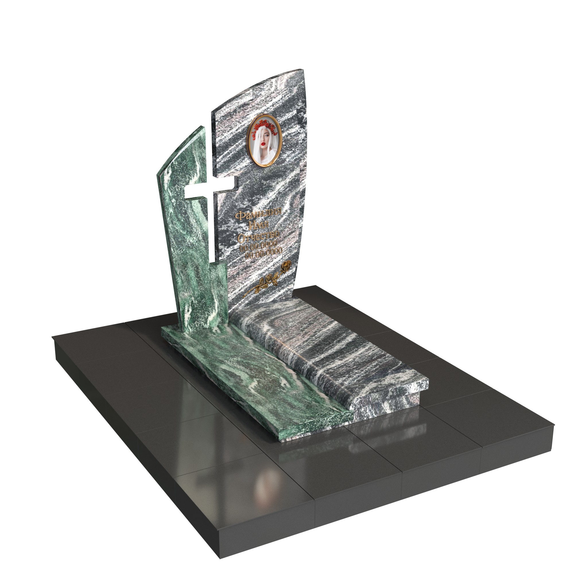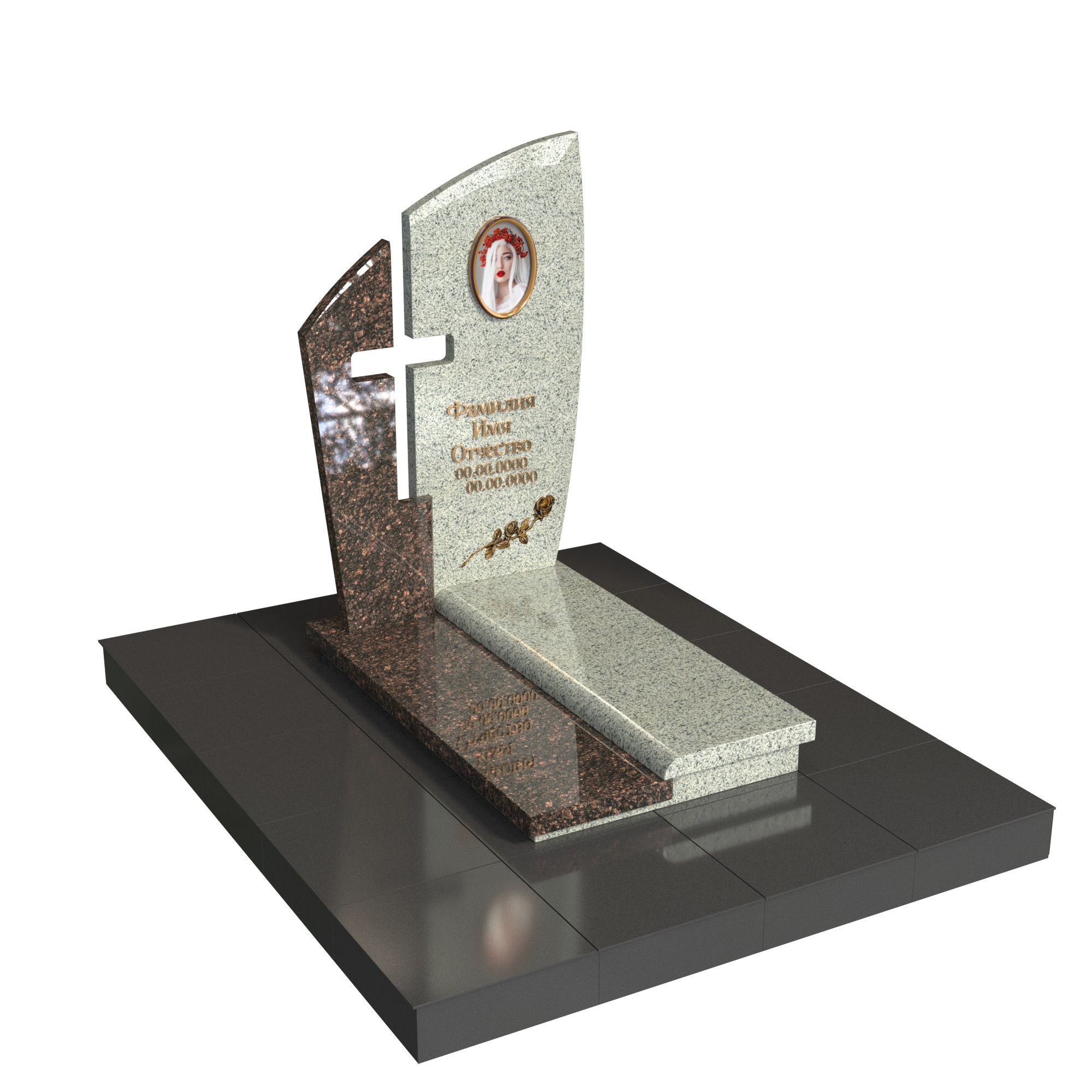 Памятник «Крест надежды» — современная модель из натурального камня с двухслойной стелой. Передняя плоскость с плавным изгибом и задняя контрастная часть образуют прорезной крест, символ веры и защиты. В верхней зоне — овальный фотомедальон; на основании — вытянутая плита с аккуратным бортом, поддерживающим строгую геометрию.