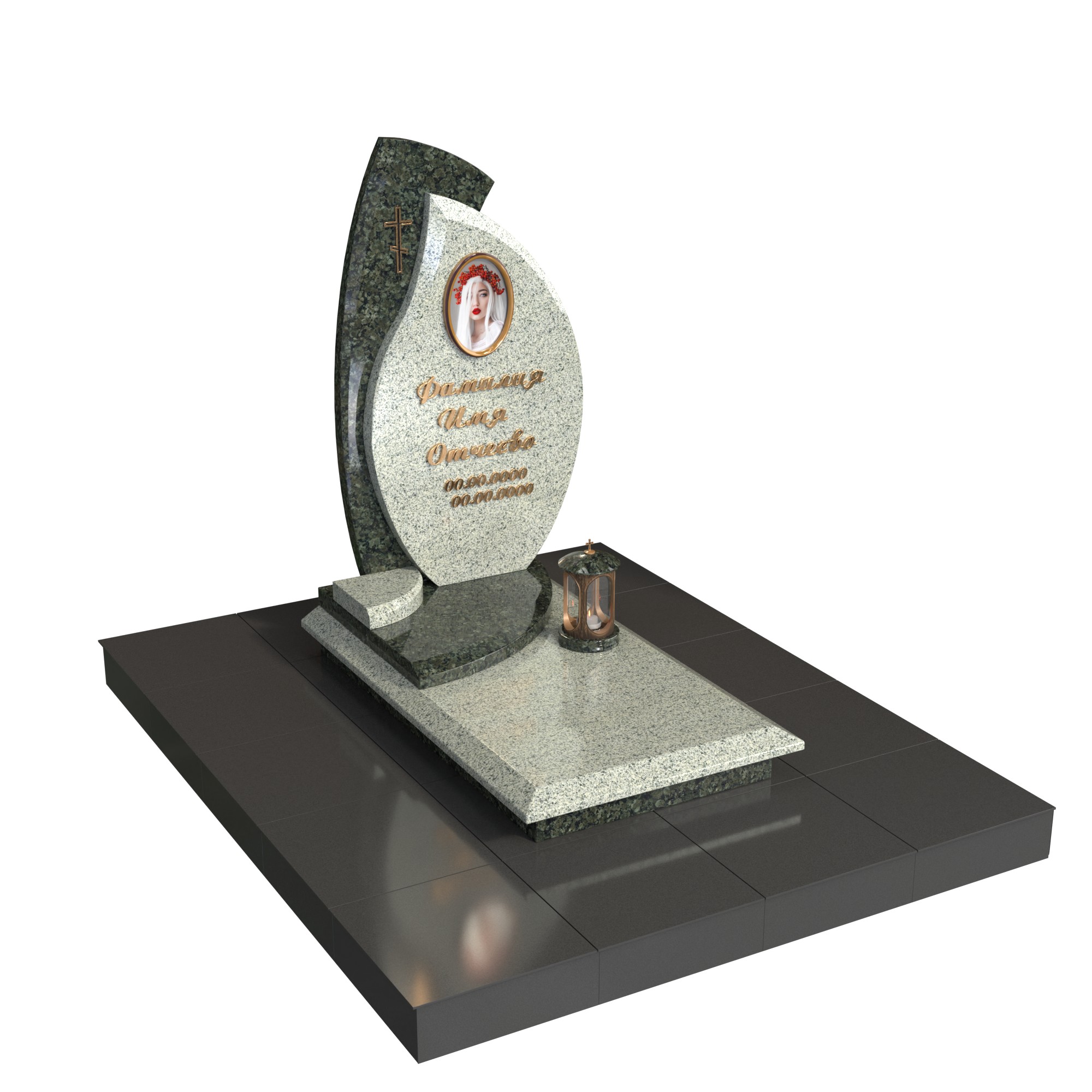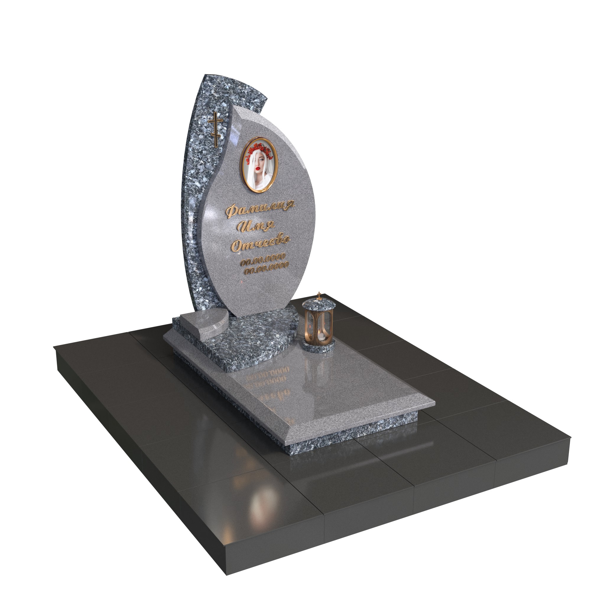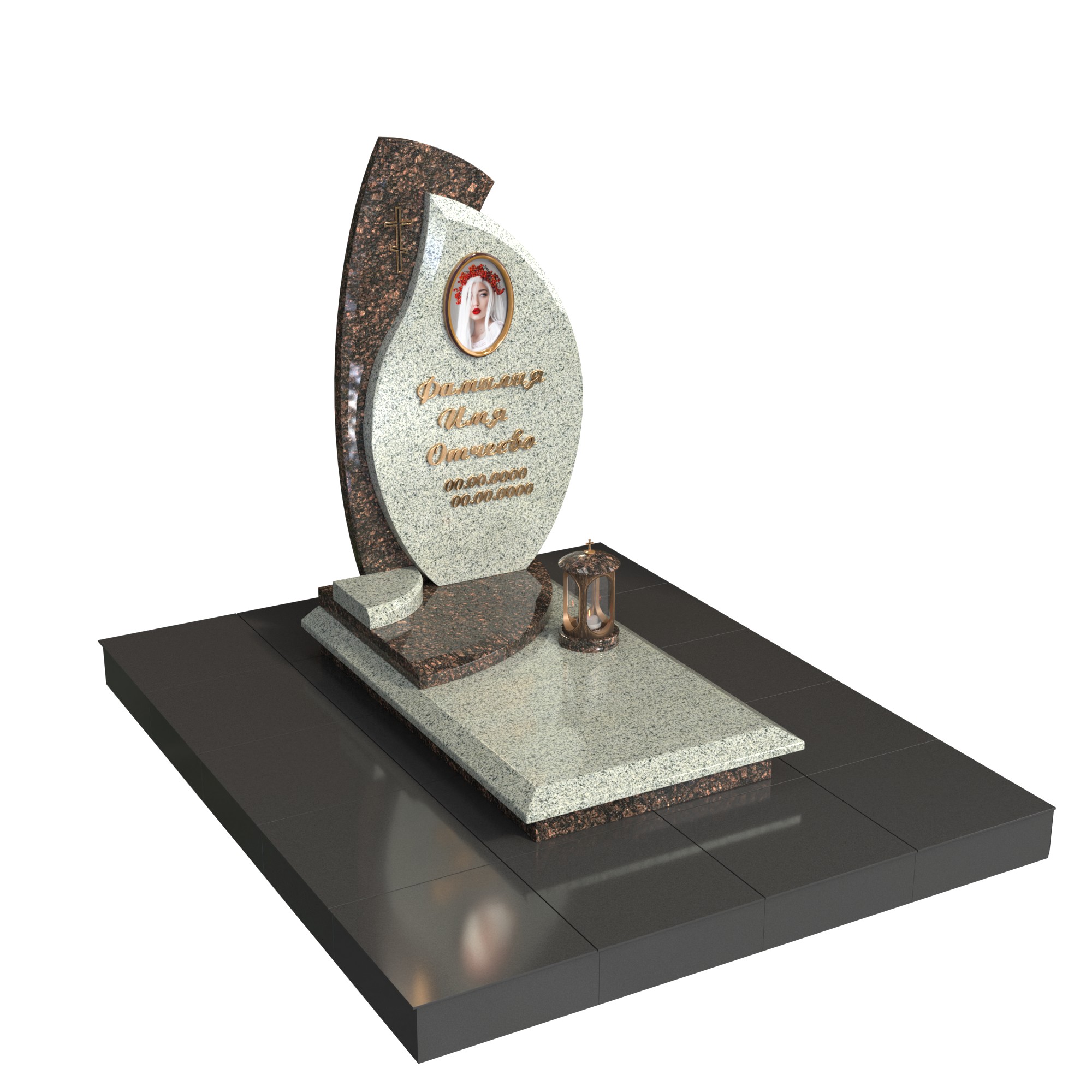 «Капля света» — элегантный одиночный памятник из комбинированного гранита с фигурной стелой в форме капли. Контраст светлого и тёмного камня подчёркивает линию силуэта и делает композицию выразительной в любом окружении. В верхней части стелы размещается овальный портрет (фотокерамика/стекло), ниже — аккуратная надпись. Полированная надгробная плита на многоуровневом постаменте и лампада образуют законченный мемориальный ансамбль.
