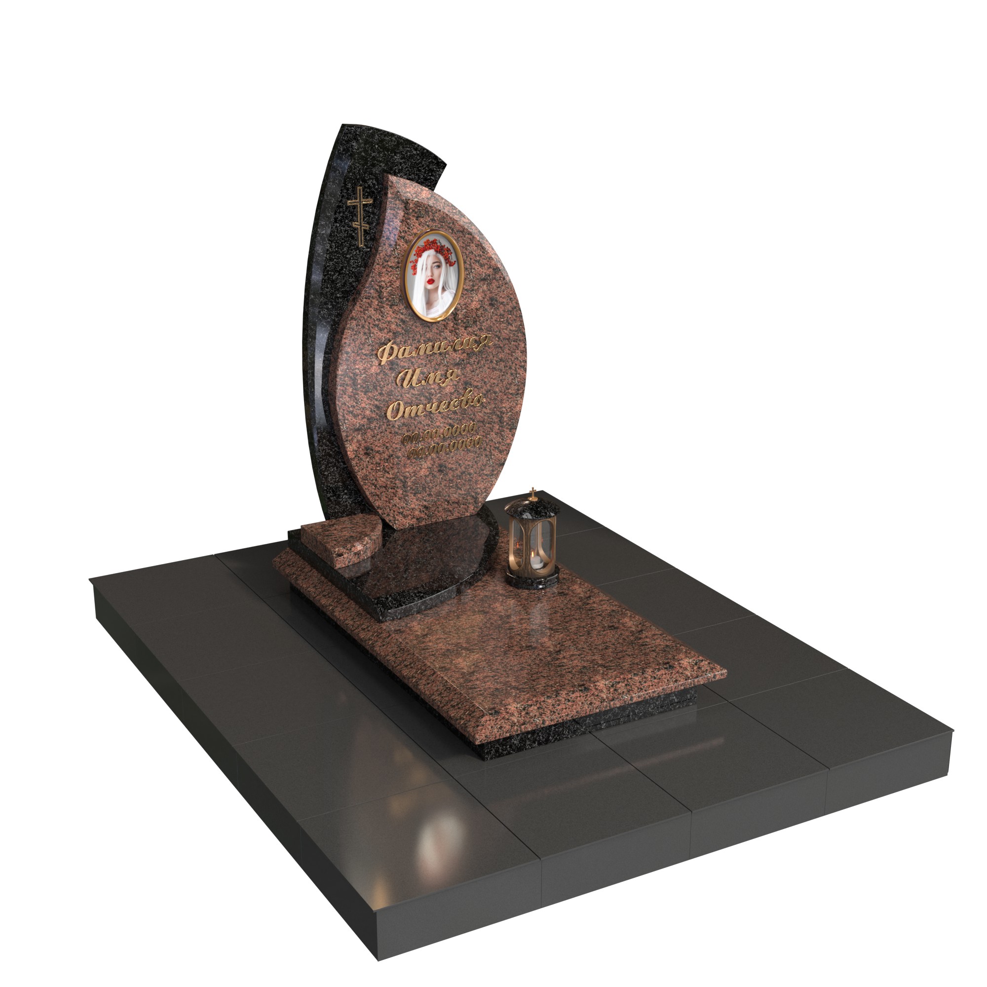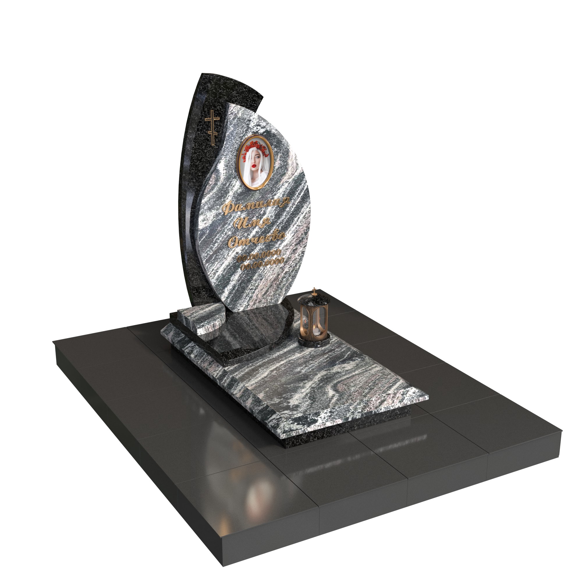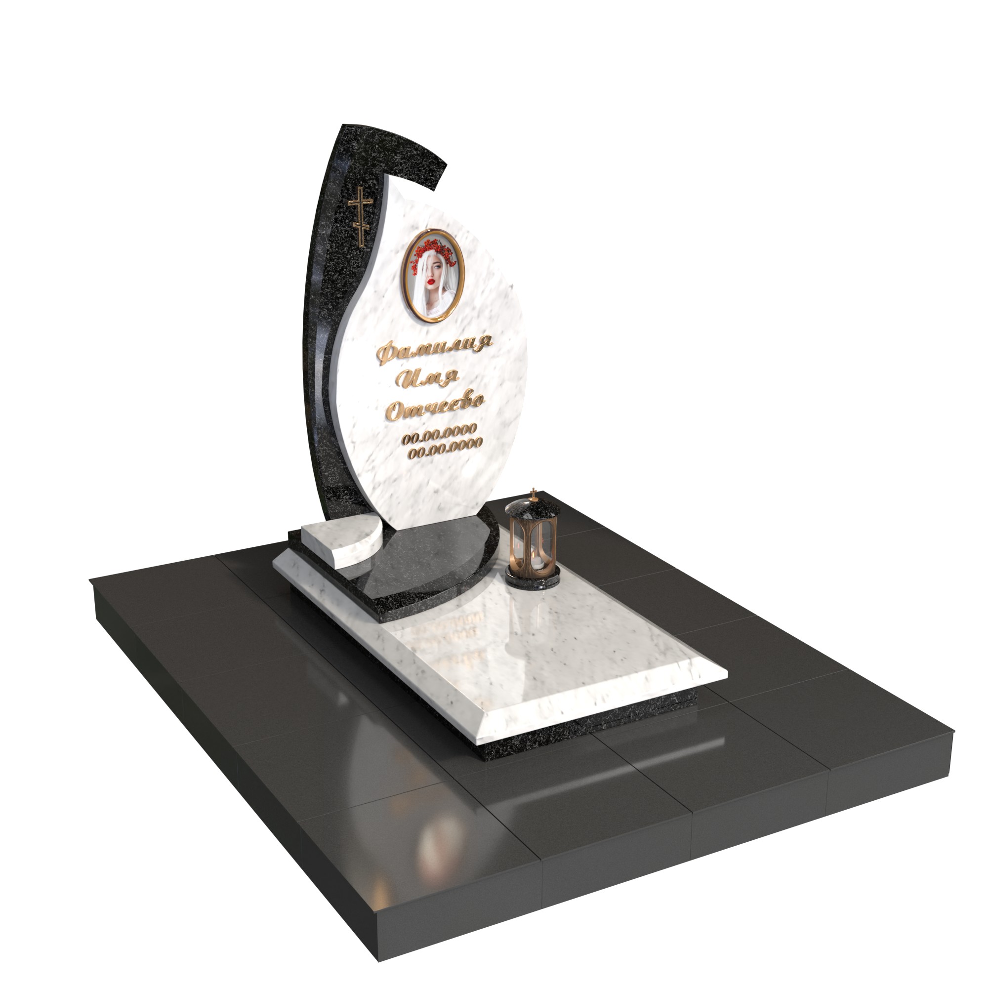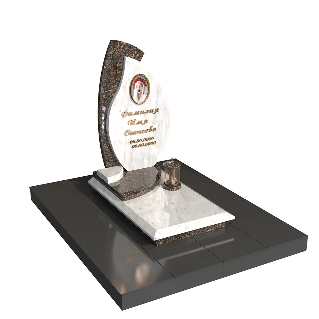 «Капля света» — элегантный одиночный памятник из комбинированного гранита с фигурной стелой в форме капли. Контраст светлого и тёмного камня подчёркивает линию силуэта и делает композицию выразительной в любом окружении. В верхней части стелы размещается овальный портрет (фотокерамика/стекло), ниже — аккуратная надпись. Полированная надгробная плита на многоуровневом постаменте и лампада образуют законченный мемориальный ансамбль.