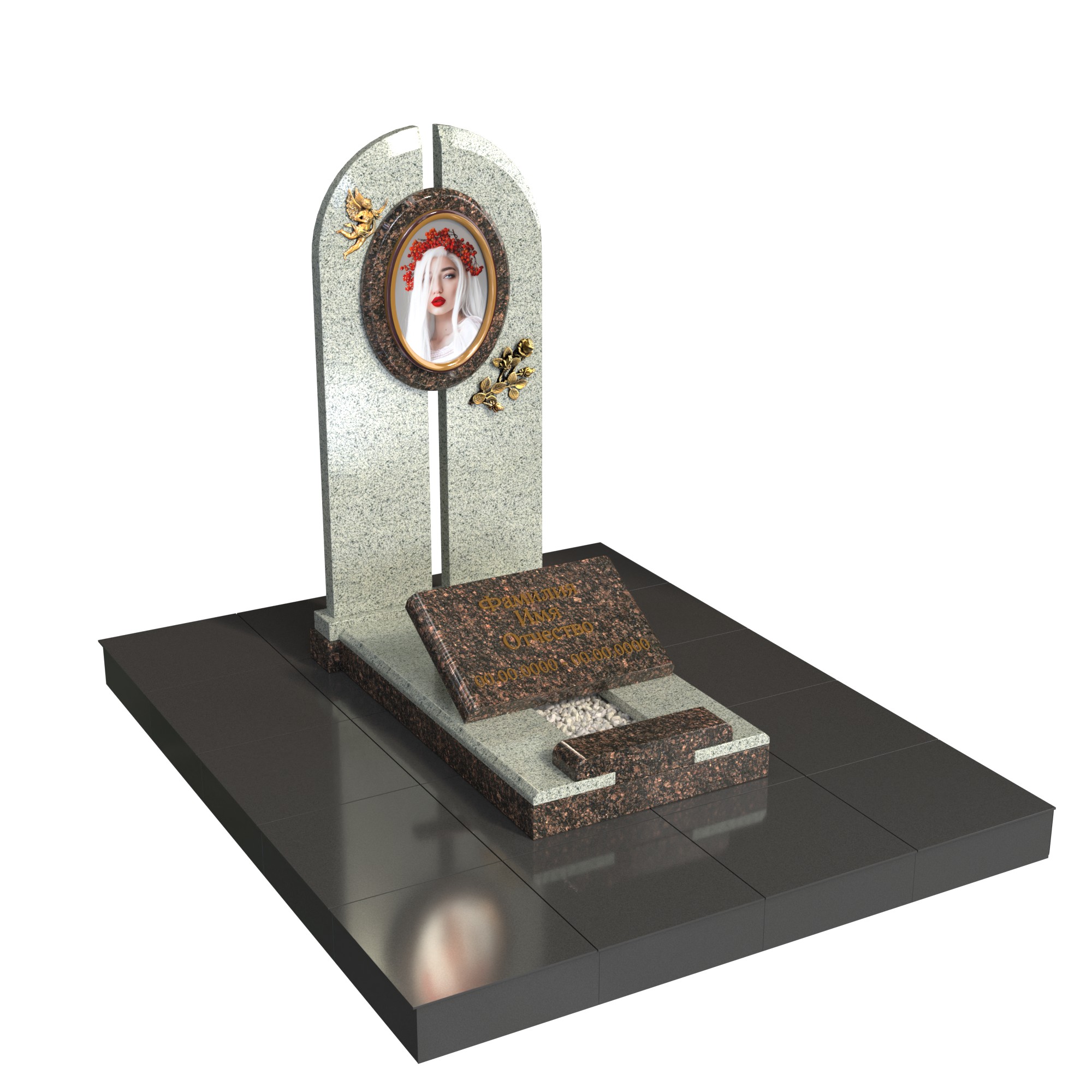 Памятник «Круг света» — современная модель из натурального камня с изящной арочной стелой, разделённой вертикальным прорезом. В центре — круглый фотомедальон в рамке; декоративные бронзовые ветви подчёркивают торжественность. На подиуме выполнена наклонная плита-«книга» для имён, дат и эпитафии. Аккуратный борт и встроенный мини-цветник из крошки придают комплексу завершённый, ухоженный вид.