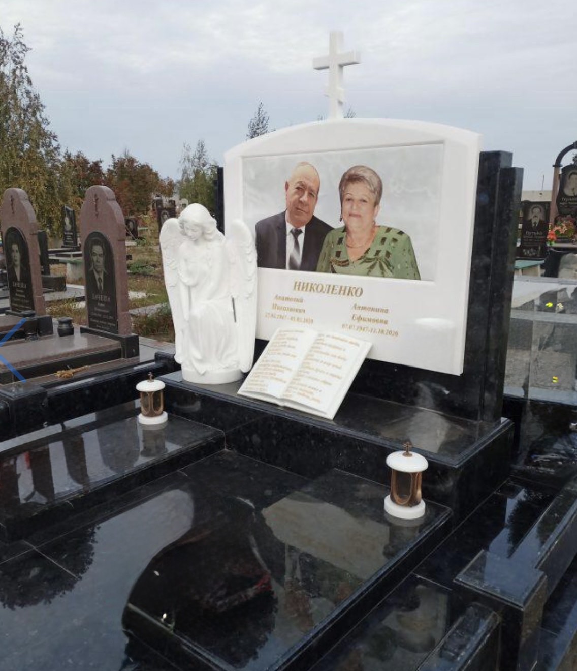 На фото представлен элегантный мраморный памятник на двоих, выполненный в светло-белом оттенке с аккуратной вставкой цветного фотопортрета. Композиция дополнена мраморной фигурой ангела, символизирующей защиту и духовную связь, а также гранитной книгой с эпитафией. Основание и цоколь выполнены из тёмного гранита, что подчёркивает контраст и изысканность памятника. В комплексе использованы бронзовые лампады, дополняющие образ.